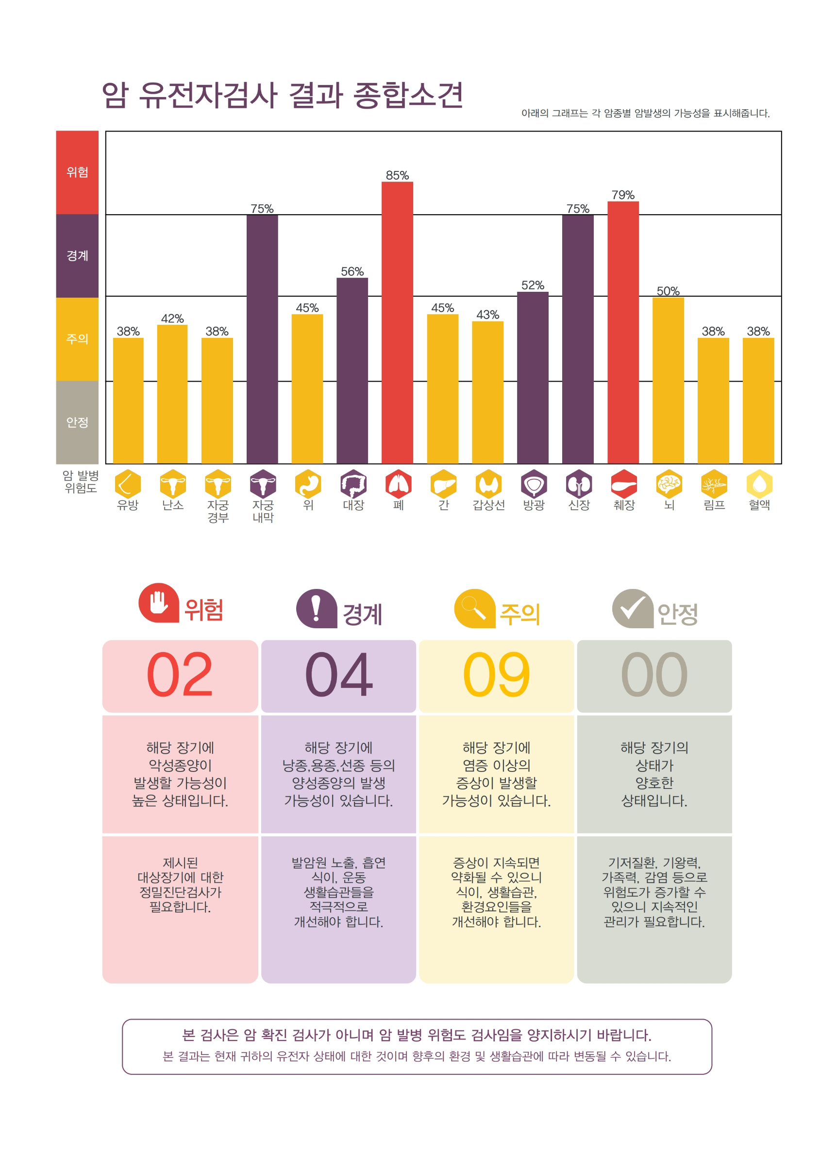 암환자들에게 공통적으로 나타나는 암유발 돌연변이를 분석하고, 특정 암종에서 특이적으로 발생하는 돌연변이들도 확대분석함으로써 검사시점의 암 발생 위험도를 분석합니다.
